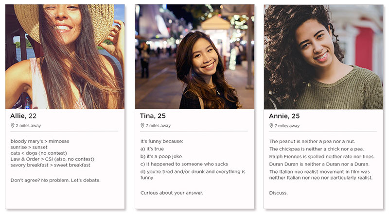 | Originality | “I like long walks on the beach.” | “I enjoy long walks on the beach, cute dogs, and my weekly session with my therapist.” | |